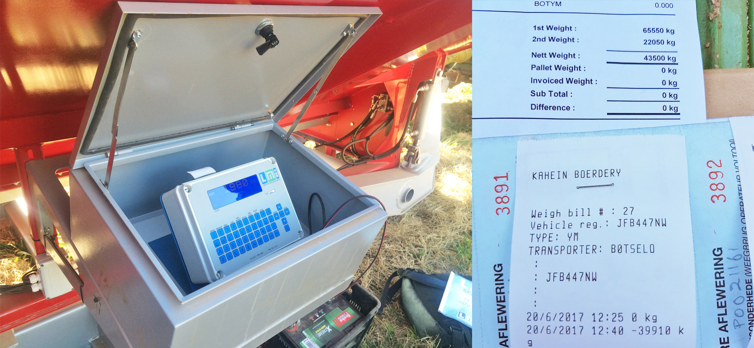 Die AgriCAD elektroniese weegsisteem met drukker wat ‘n vragbriefie genereer, verseker effektiewe kontrole van graan om diefstal te monitor en boekhouding te vergemaklik.